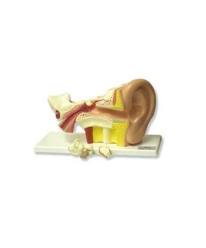 Anatomical ear model representing external, middle, and inner structures. Made of durable PVC, it includes the auricle, auditory canal, tympanic membrane, ossicular chain, Eustachian tube, cochlea, and auditory nerve. Available in various magnification capacities.