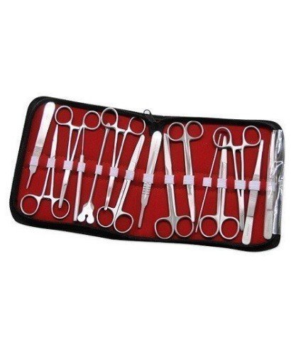 Complete dissection kit consisting of 15 stainless steel pieces.