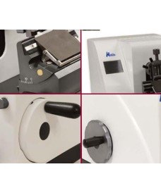 El avance se hace mediante un volante manual de manejo suave y con una manivela ergonómica. Su control durante el proceso de corte es fácil y permite variar el ángulo de orientación de la hoja de 0 a 14°, por lo que se puede inclinar la hoja con respecto a la muestra. Dispone sistema de avance macro en lateral izquierdo en posición rebajada.