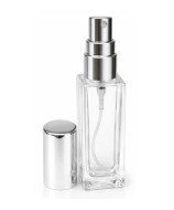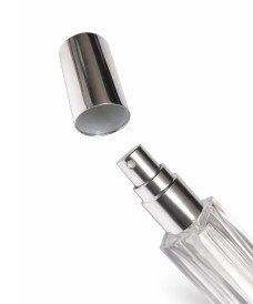Frasco de vidrio transparente 10 ml con spray pulverizador y tapa plateada