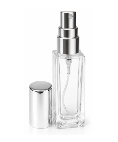 Frasco cuadrado de vidrio transparente con spray vaporizador y tapa plateada, 10ml