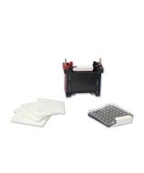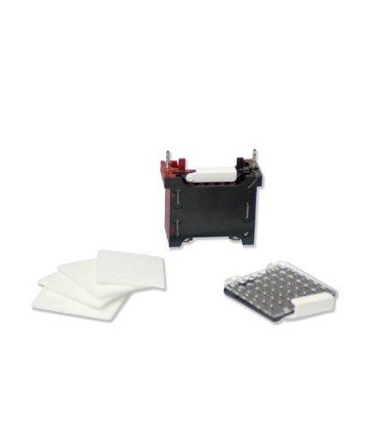 * deux cassettes en polycarbonate avec plaques perforées permettant le transfert simultané de deux gels et de quatre tampons nécessaires au processus.